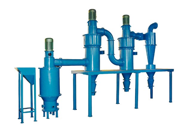 HS气流粉碎机是一种利用高速气流来实现干式物料超微粉碎的设备。它由粉碎箱、截止分级机、喂料装置、气源系统、捕集系统等组成。物料通过喂料装置进入粉碎室、压缩空气通过特殊工艺设计的喷嘴向粉碎室高速喷射,物料在高速射流中加速,并在喷嘴交汇处反复冲击、碰撞,达到粉碎。被粉碎的物料随上升气流进入分级室,由于截止分级机的高速旋转,粒子即受到分级转子产生的离心力,又受到气流粘性作用产生的向心力,当粒子受到离心力大于向心力,即分级径以上的粗粒返回粉碎室继续冲击粉碎,分级径以下的细粒子随气流进入旋风分离器,捕集器收集,气体由引风机排出。