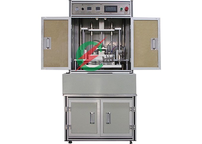 此设备适用于软包装电池化成分容后的二次抽气封口工作。设备操作流程:人工放电池到夹具上,双手按启动按钮,转盘旋转180度,上腔下腔