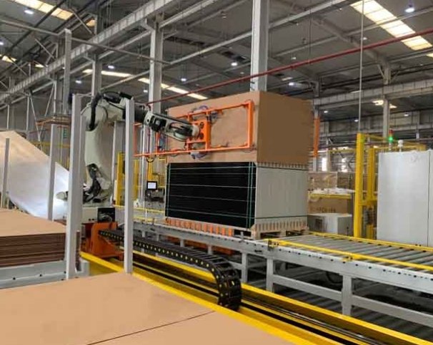 应用与多种光伏组件自动包装线套箱功能,可根据客户需求实现单线体兼容多规格产品的套箱包装功能。