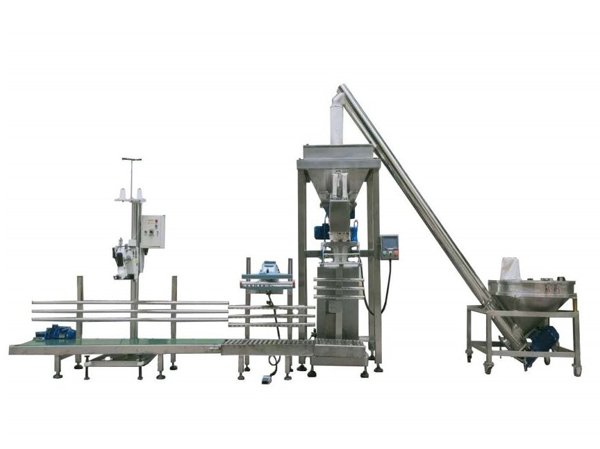 6、工作流程:螺旋上料机自动上料→人工手动开袋套住夹袋装置→踩下脚踏开关,夹袋器将袋子夹住→设备自动去皮(双螺旋自动给料直到到达***终数值)→再踩下脚踏开关,夹袋器松开(也可调至计量充填完成自动松袋模式)→人工把袋子滑送到热封口处(袋子下方有无动力滚筒)、踩下热封口机脚踏开关(自抽真空自动热合)→再到下一道工序缝包→缝包机自动启动、缝包机和输送带同步运行→封包完毕机器自动切线→自动倒包整形→整个工作流程完毕。(本机全道工序可由一人操作)。