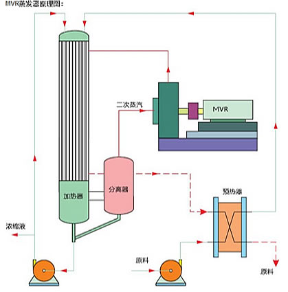 MVR蒸发器是指机械式热能压缩蒸发器,是国际上二十世纪九十年代末开发出来的新型高效蒸发设备。其工作原理是蒸发器产生的二次蒸汽经机械式压缩机(类似于鼓风机)压缩后,温度提升5~8℃,返回蒸发器用于加热热源,新鲜蒸汽仅用于补充热损失和补充进出料热焓,从而大幅度减少蒸发器对外来新鲜蒸汽的消耗。TVR蒸发器中,仅有一部分蒸汽被压缩,而在MVR蒸发器中全部的蒸汽都被压缩,所以热效率更高。在沸点进料时,除开车启动外,整个蒸发过程中无需生蒸汽。这样,原来要废弃的蒸汽就得到了充分的利用,生蒸汽的经济性相当于多效蒸发的30效。