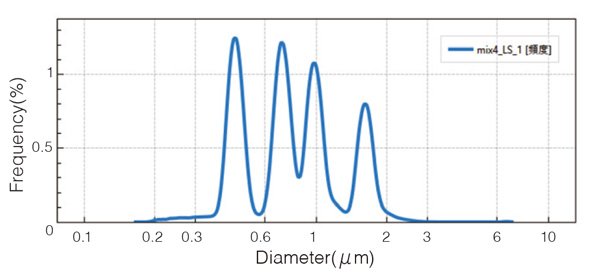 下图为离心粒度分析仪测量含有四种相同浓度的二氧化硅标准颗粒的混合样品的结果,四种不同粒径颗粒所占面积几乎相同。因为颗粒按离心力分类,使用密度梯度模式测量可以获得准确的粒度分布。