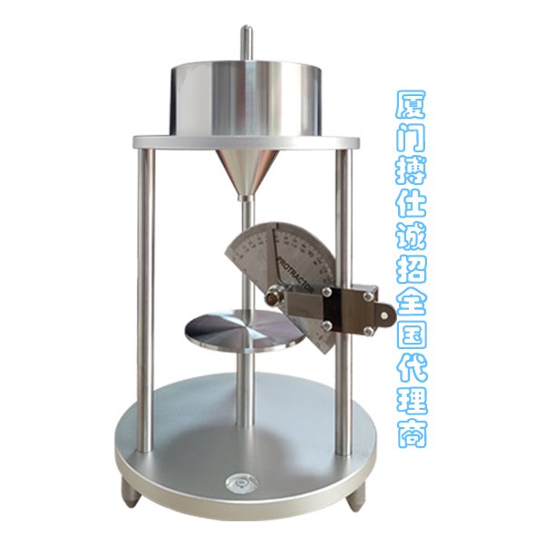 原理:足够满溢料盘的粉尘从漏斗口注入到水平料盘上;测量粉尘堆积斜面与底部水平面所夹锐角,即粉尘安息角。