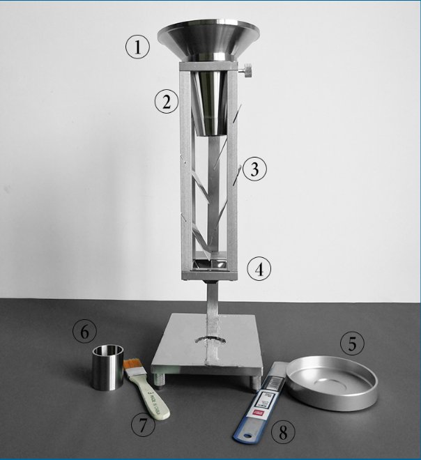 3.1 用勺细心地将粉末放在上部组合漏斗的筛网上,经过布料箱、方形漏斗,流入圆柱杯中,直到装满,并有粉末溢出为止。