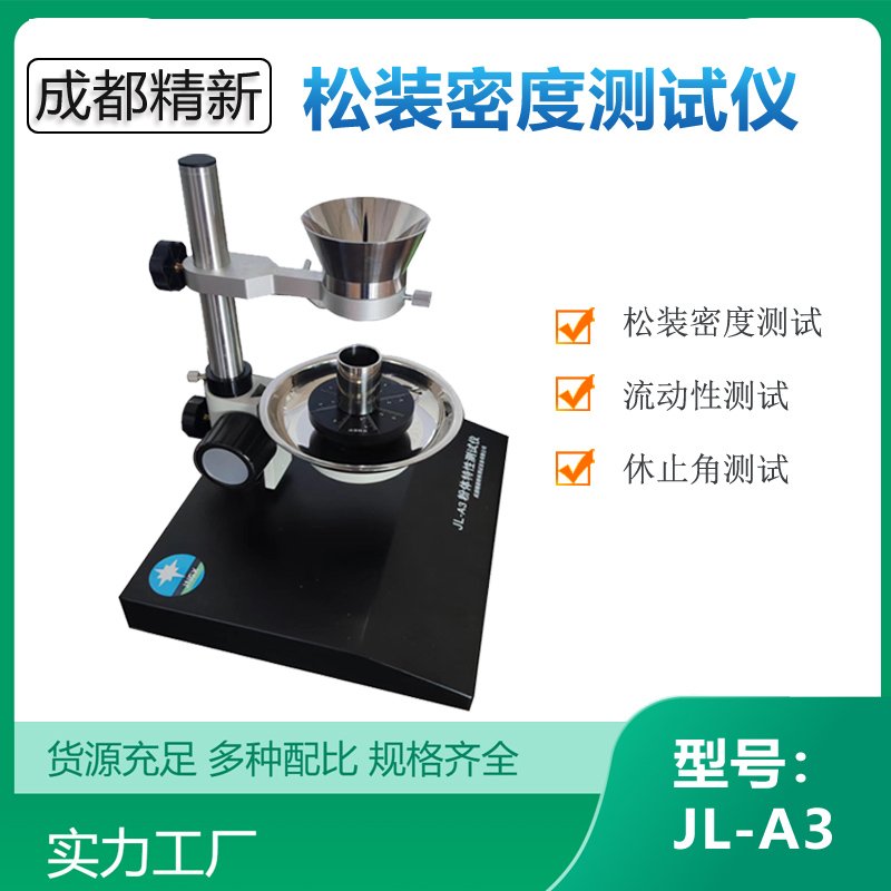 JL-A3粉体特性测试仪,依据国标GB/T1482-2010金属粉末流动性测定,标准漏斗法(霍尔流速计),GB/T1479.1-2017松装密度,GB/11986-89休止角测定法。该仪器结构实现3种测试功能,粉末流动性、安息角(又称休止角)、松装密度(又称堆积密度),是粉体行业测试粉体特性的理想仪器。
