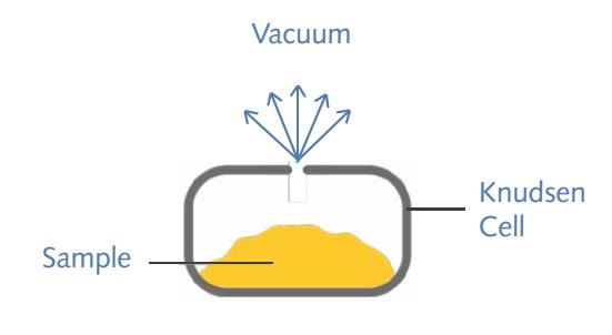 常规实验中,样品放置于钛金属制造的带有已知面积孔的克努森池中,然后加热到实验温度下。质量流失率与凝聚态的蒸汽压P有关,如克努森方程所示(方程1),其中dm/dt表示在克努森池中质量随时间的流失率,M为样品摩尔质量(mol/g),R为气体常数,A表示面积,T为温度。