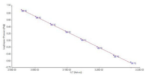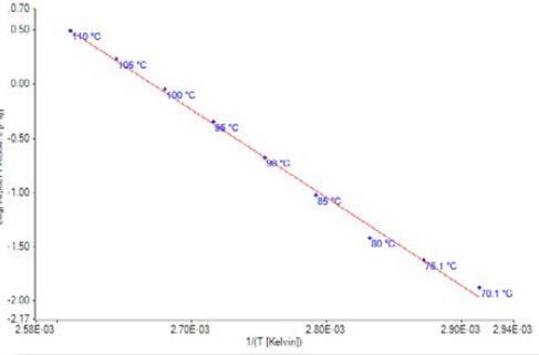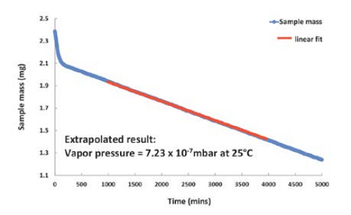 dm/dt是在一段时间内对实验中质量数据的*小平方回归拟合得到的斜率值。采用方程1,dm/dt可用来计算蒸汽压。在不同的温度下测试一系列蒸汽压,可以用来测试克劳修斯-克拉佩龙方程(方程2)中的常数A和B,从而计算出蒸发焓ΔH,或者升华热。