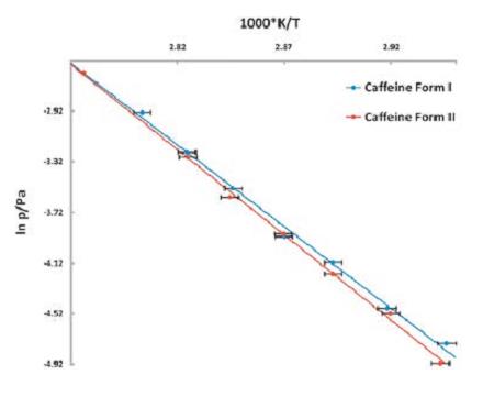 图4 咖啡因的蒸汽压和温度稳定性研究,Form Ⅱ型的蒸汽压更低,显示其更稳定