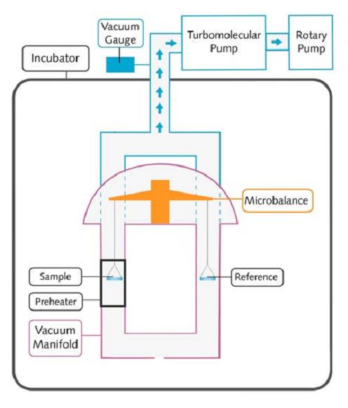 克努森渗出法是一种动态比重技术,其基于在已知的压力下计算蒸汽分子通过一个已知直径的孔洞进入克努森池的真空中的逸出速率而得出。经过孔洞的质量流失率由在VPA系统中的SMS公司超级天平测出。通常,在20到400℃的温度范围内可研究1到100mg的样品质量变化。