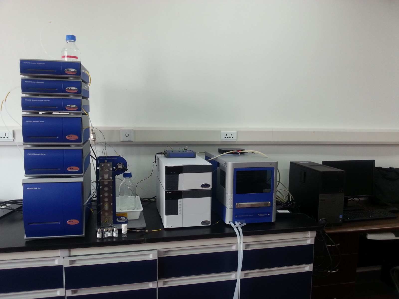 图片是厦门大学海洋学院的全套仪器,从左至右依次为:AF2000AT型主机及S3智能分流泵、水相分离通道盒(竖直放置)及手动进样器、紫外-二极管阵列检测器和紫外荧光检测器(两个叠放的白色长方盒子)、PN8050馏分收集器。