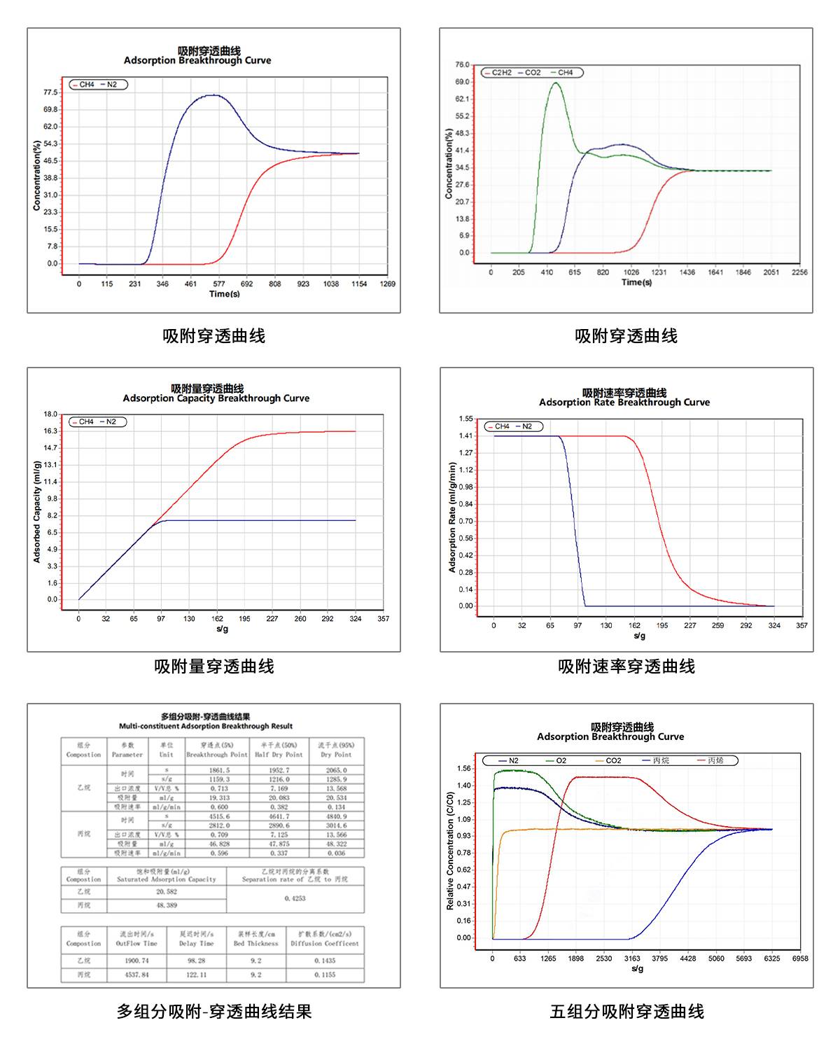 ◆ 利用吸附穿透曲线分析仪自带热导检测器测定以下不同实验条件的双组份的吸附穿透曲线:不同吸附剂,不同温度,不同压力,不同床层厚度,不同气体浓度,不同穿透流量等;