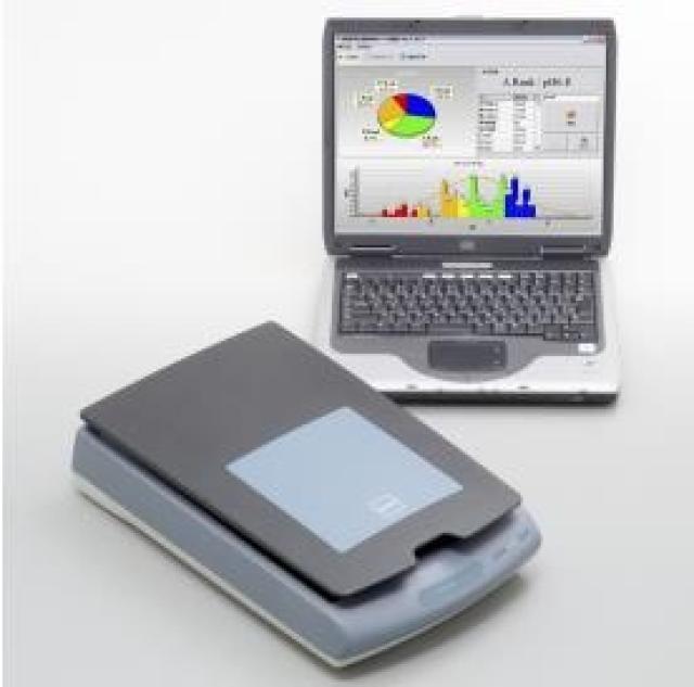 白米鲜度判定仪是将白米用pH 药剂浸泡变色后,用扫描器输入和分析每一粒米的影像来进行判定其新鲜度的。本仪器是应用显示药剂酸度的原理进行判定的,可能与其他的判定方法相同。