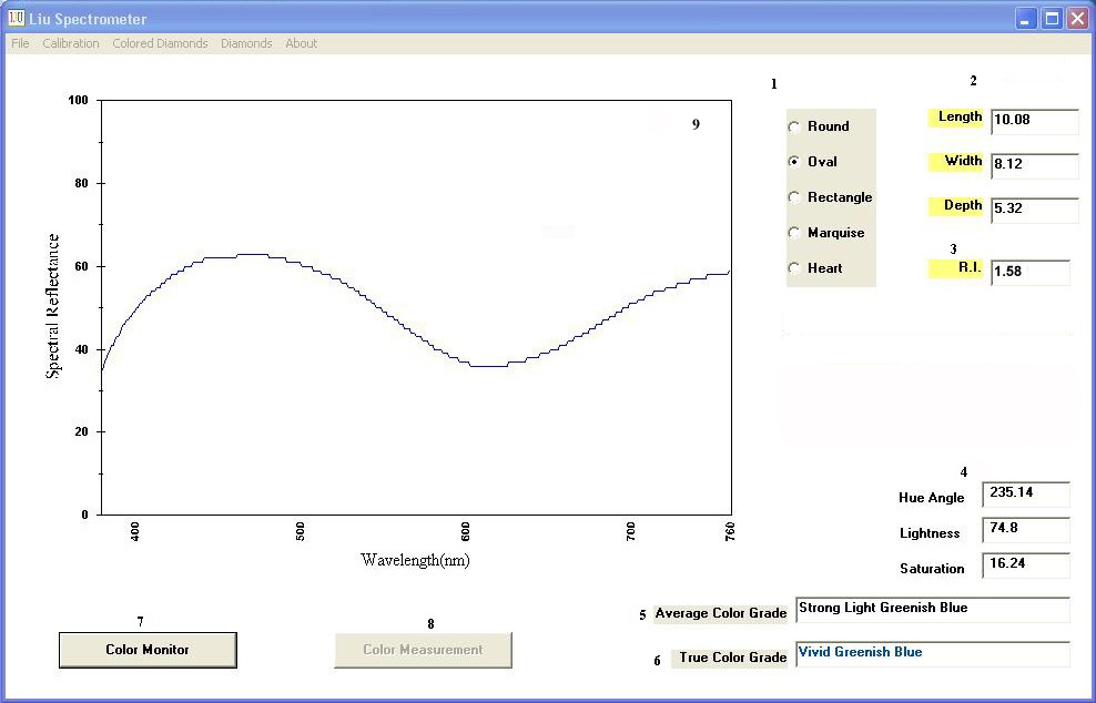 图二. 彩色宝石的颜色测量与颜色分级软件界面:1.形状;2.尺寸;3.RI; 4.荧光;5.CIELAB; 6.平均颜色分级;7.真颜色分级;8.颜色监控按钮;9.颜色测量按钮10. 光谱反射率