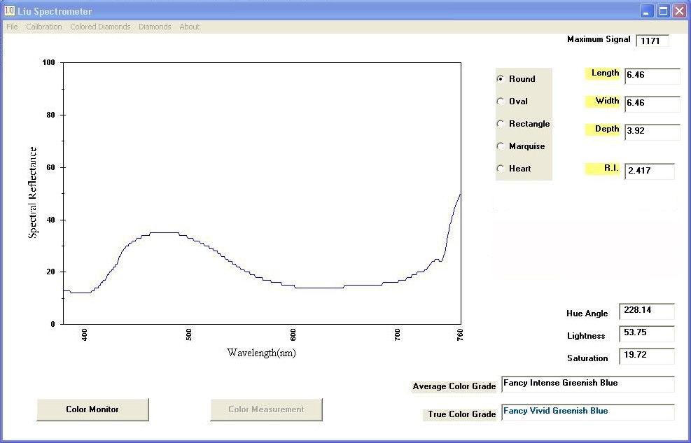 独特彩钻颜色分级软件插件用于LiuLab光谱仪。这个软件能自动计算彩钻的“特征颜色”,采用模糊逻辑代数算法与查找表确定彩钻分级。采用LiuLab光谱仪独特技术获取彩钻分级的颜色精度与准确度要远远优于人眼分级。图三显示了彩钻颜色与颜色分级测量的测量窗口