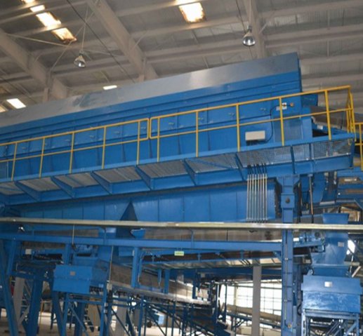 固体废物的分选是把固体废物中可回收利用的或不利于后续处理、处置工艺要求的物料分离出来,是固体废物处理工程中的重要环节和重要操作之一。分选除了必须对垃圾中各类物料进行有效地分选,实现以资源化为目的的垃圾分类外,还对气体、扬尘等收集处理,以改善工作环境,减少对环境的二次污染。万昌针对我国城市生活垃圾混合包装、混合收集的现状,从综合处理的角度出发,提高城市生活垃圾分选工艺的效果和效率,简化后续处理工艺路线,降低投资和运行成本特生产制作出的垃圾分选处理设备。该设备为卧式结构,倾斜安装,安装倾角和筛筒转速共同调整物料在筛筒内的停留时间。筛筒使用4个支撑轮,电机带动筛筒一侧的2个支撑轮进行摩擦传动使筛筒旋转,另外2个支撑轮起到支撑和从动的作用。