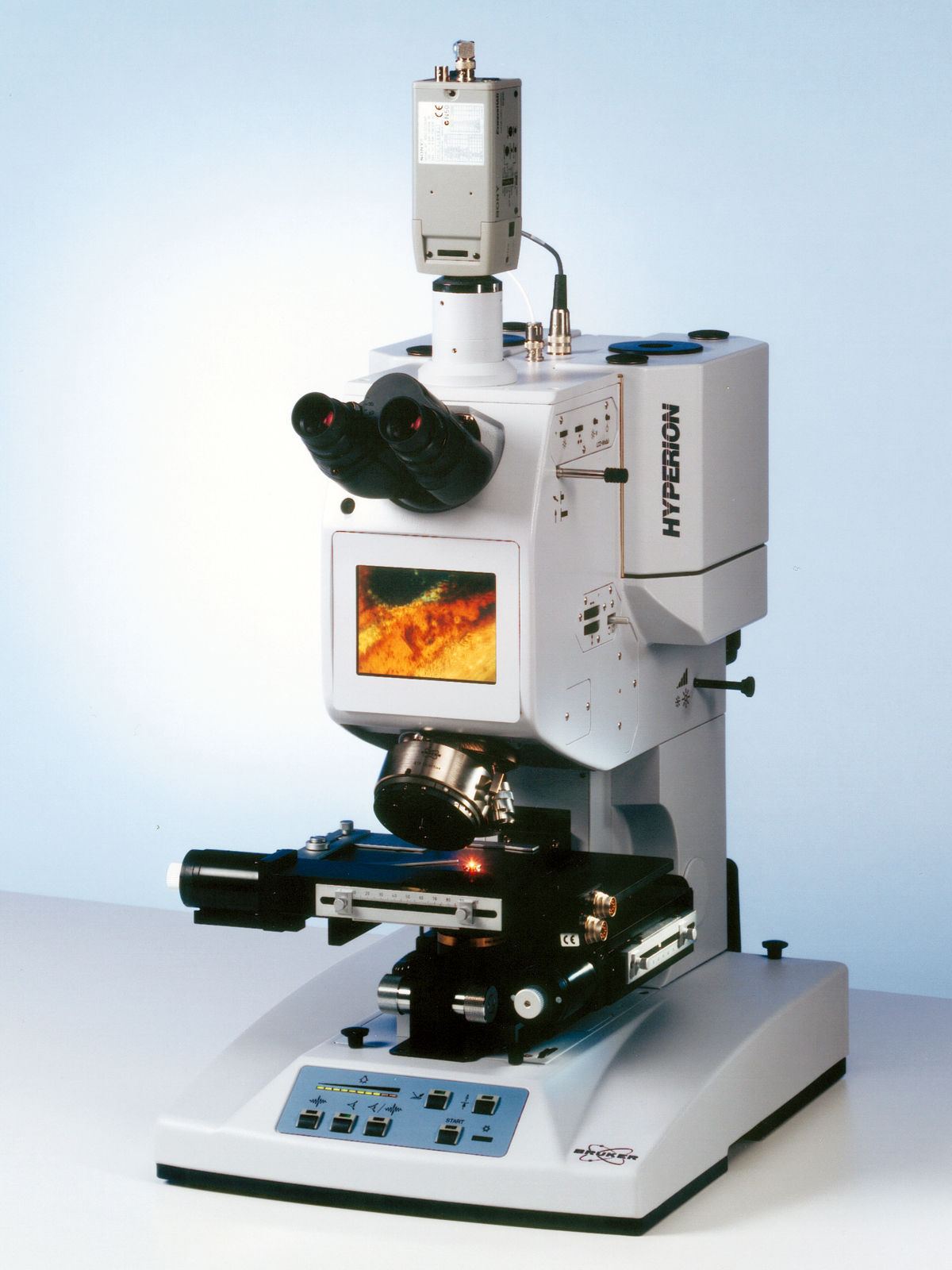 样品的CCD图像不仅可以在计算机的OPUS软件上显示,也可以显示在显微镜前面板的LCD上(HYPERION2000/3000)。该LCD显示屏使得定位样品和识别待测位变得更加方便。所有的可见光图像将与测量谱图、以及他们的采样位置一起被保存在一个文件中。HYPERION标准配置一个双筒目镜,可以提供更高质量的可见光图像。因此,即使样品具有较弱的可见对比图像,您依然可以轻松地找到待测区域。