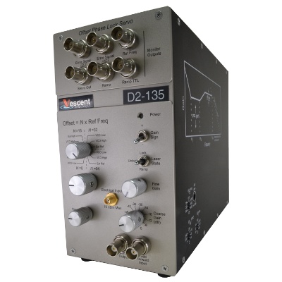 D2-135偏移锁相伺服(OPLS)设计用于精确控制与迅速调节两激光器间的频率失谐。D2-135提供主从激光器之间极为紧密的峰值锁定。D2-250外差模块可以方便地实现两激光束的重叠与光纤耦合,为拍音提供一种简单的光学输入,并与D2-160拍音探测器的FC光纤接口匹配,从而得到电学拍音。通过SMA接口可将D2-160或者其他高速探测器得到的电学拍音输入给D2-135。D2-135 OPLS为优化大多数激光器提供了完整的伺服回路定制。