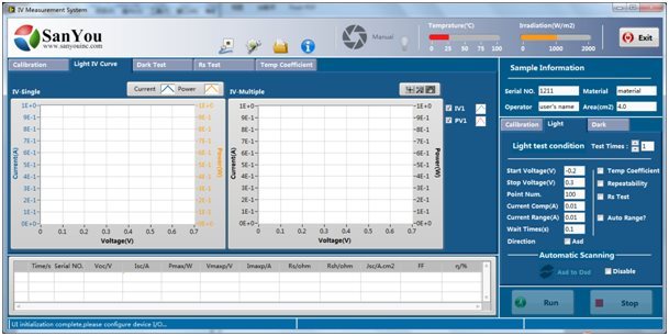 4)多次测量功能:每次测量之间时间间隔可调,光照和暗态条件下I-V曲线多次测量,并曲线叠加显示,太阳能电池基本参数统计功能,数据自动排序保存;
