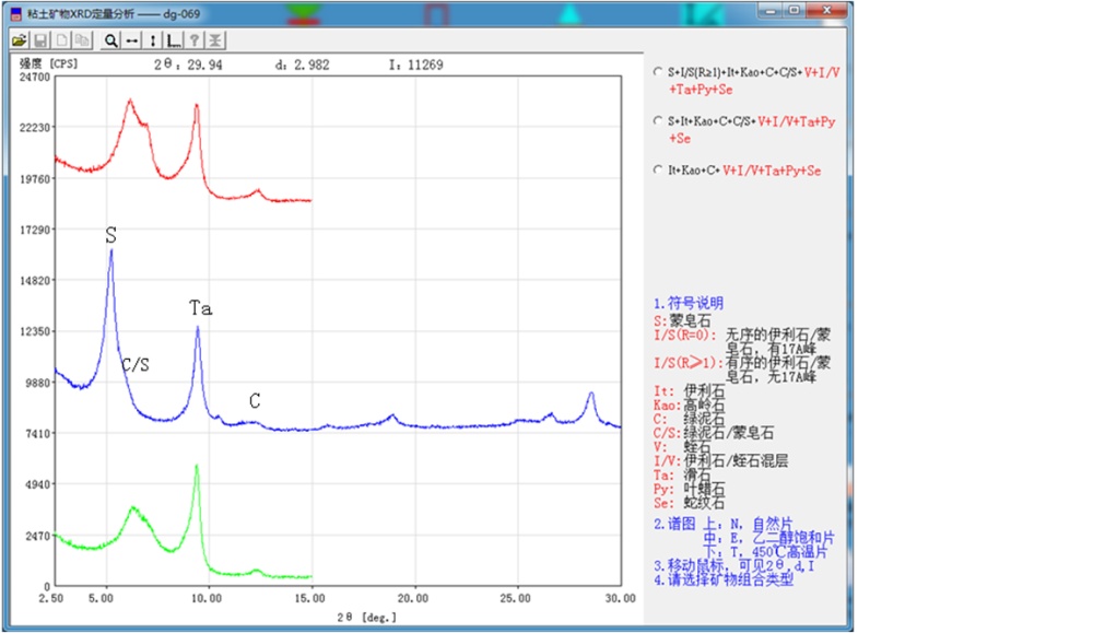 例3样品 尾号F005 土壤粘土(微构实验室提供) 图3。这里没有膨胀性矿物,只有V,I/V,It,Kao,Ta。选择类型II-3计算,在E谱图上即可完成数据处理。其结果是:V:6 I/V:15 It26 Kao:50 Ta:3。
