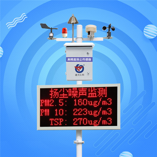 以建大仁科泵吸式噪声扬尘检测仪为例,设备采用激光散射原理测量,用气动流量泵作为动力,压强比风扇的强很多,大颗粒粉尘不会附着到腔体内部,并且测量腔体采用直通式结构,长时间使用不会造成灰尘堆积,稳定性比普通扬尘要好的多,数据的一致性也好很多。另外还带有自动除湿装置,消除雨雾影响,不会出现雨雾天PM值爆表的问题。还可以选配增加声光报警器、防水箱、避雷针,声光报警器可实现现场声光报警,防水箱内装配开关,方便用户现场断电,并控制现场雾炮等喷淋设备。