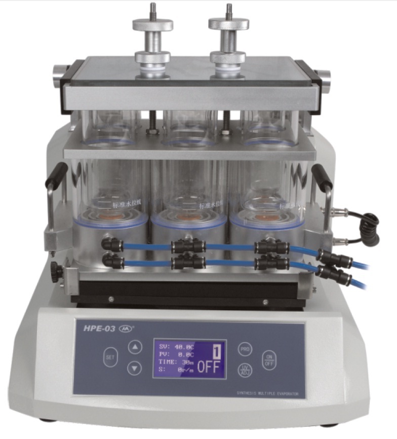 HPE-03平行蒸发浓缩仪简介:平行浓缩蒸发仪是一台在真空条件下对大批量样品快速、平行浓缩、蒸发到特定体积的小型仪器。该产品应用于环境分析和农药残留分析等大批量样品的浓缩。如色谱蒸馏的蒸发,平行萃取液的蒸发,质量控制的重量分析,平行反 应产物的蒸发。将推出平行合成反应系统。