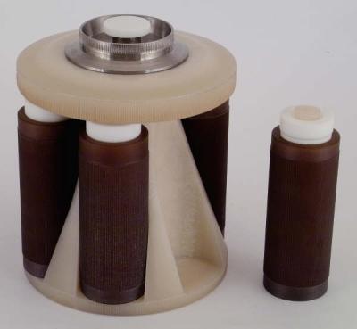 新一代“多联体消解/萃取罐”--就是在一个外罐中同时装入3-12个盛放样品的内罐而主机的压力控制系统控制联体罐的合力,即无论哪个内罐的压力超过设定值都可以得到控制。而传统的多罐消解/萃取模式中,只能控制其中的一只内罐(称为主控罐),而其余消解罐的压力都参照主控罐。由于种种因素造成微波炉腔内的微波分布不均匀,主控罐压力不能完全代表其它罐的压力,往往未受控制罐内的压力先于主控罐达到或超过了设定压力,而得不到控制,这样一来就会引起泄漏甚至爆炸。“多联体消解罐”以其独特的设计成功地克服了这一困扰业界多年的安全隐患,为国内外首创。为分析、空白、平行样品的消解/萃取提供了有利条件。