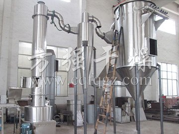 热空气切线进入干燥器底部,在搅拌器带动下形成强有力的旋转风场。膏状物料由螺旋加料器进入干燥器内,在高速旋转搅拌桨的强烈作用下,物料受撞击、磨擦及剪切力的作用下得到分散,块状物料迅速粉碎,与热空气充分接触、受热、干燥。脱水后的干物料随热气流上升,分级环将大颗粒截留,小颗粒从环中心排出干燥器外,由旋风分离器和除尘器回收,未干透或大块物料受离心力作用甩向器壁,重新落到底部被粉碎干燥。
