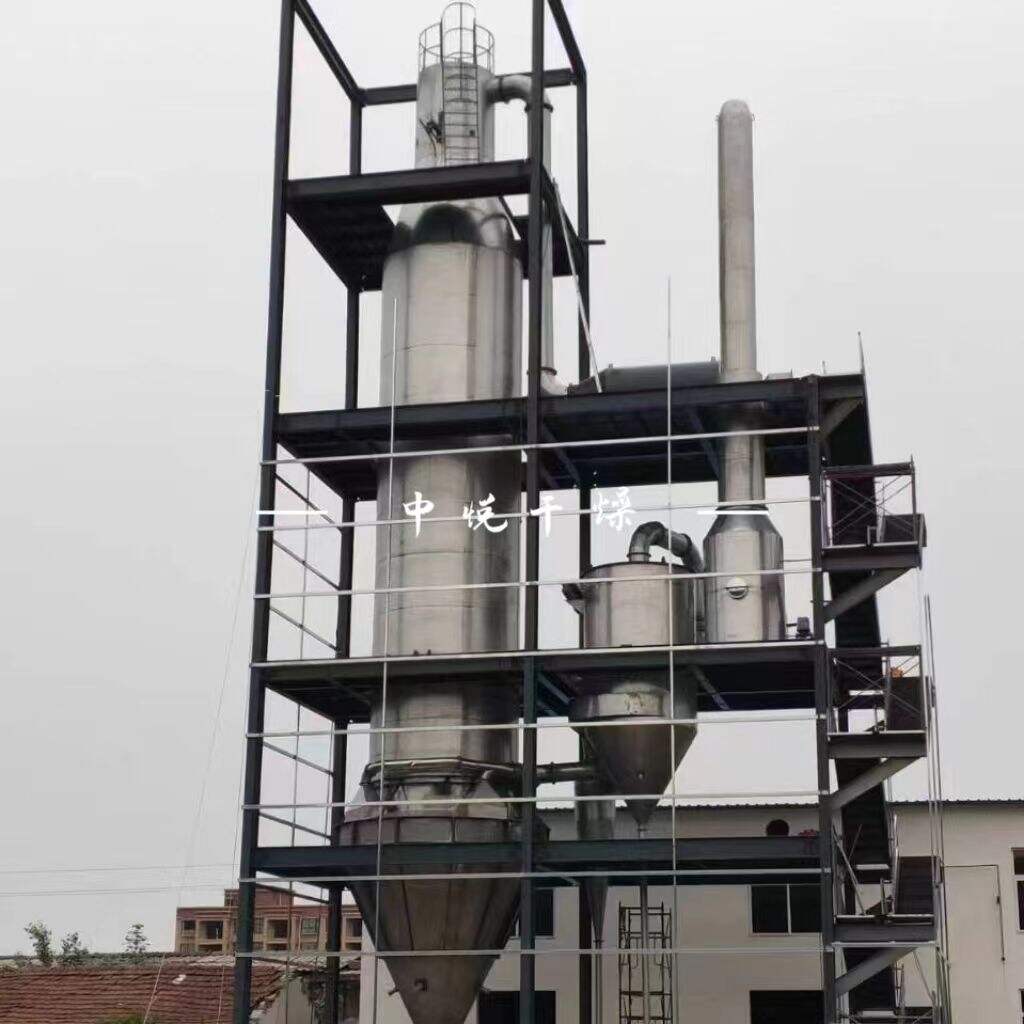 工作过程为:料液通过隔膜泵高压输入,喷出雾状液滴,然后同热空气并流下降,大部分粉粒由塔底排料口收集,废气及其微小粉末经旋风分离器分离,废气由抽风机排出,粉末由设在旋风分离器下的收粉筒收集,风机出口处还可装备二级除尘装置,回收率在96%-98%。