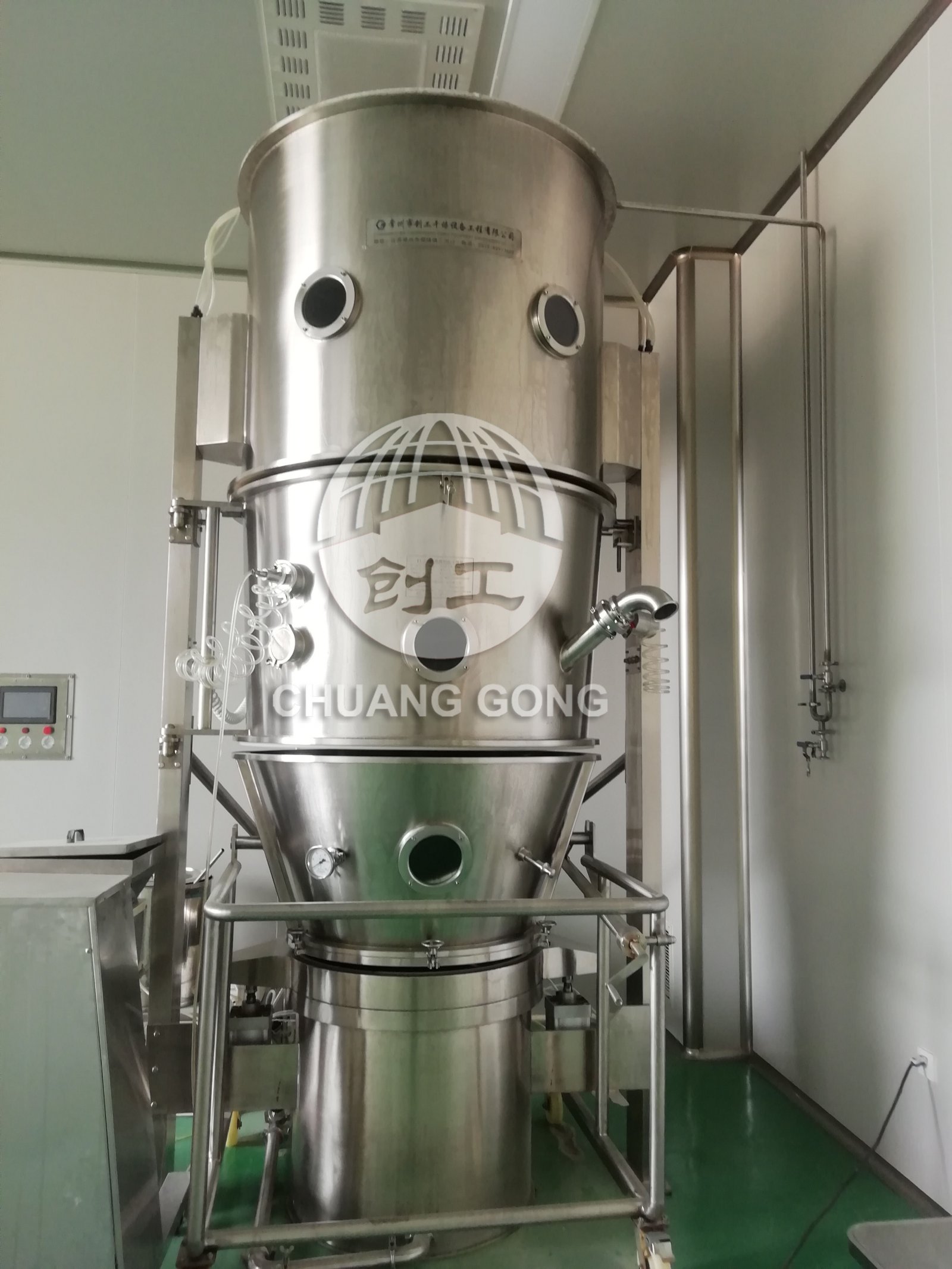 空气经加热净化后,由引风机从下部导入,穿过料斗的孔网板。在工作室内,经搅拌和负压作用形成流态化,水份快速蒸发后随着排气带走,物料快速干燥。