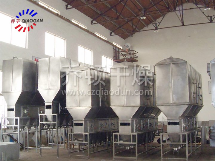 沸腾干燥,又称流化床,它是由空气过滤器、加热器、沸腾床主机,旋风分离器,布袋除尘器、高压离心风机、操作台组成,由于干燥物料的性质不同,配套除尘设备时,可按需要考虑,可同时选择旋风分离器、布袋除尘器,也可选择其中一种,一般来说比重较大的如冲剂及颗粒料干燥只需选择旋风分离器,比重较轻的小颗粒状和粉状物料需配套布袋除尘器,并备有气力送料装置及皮带输送机供选择。