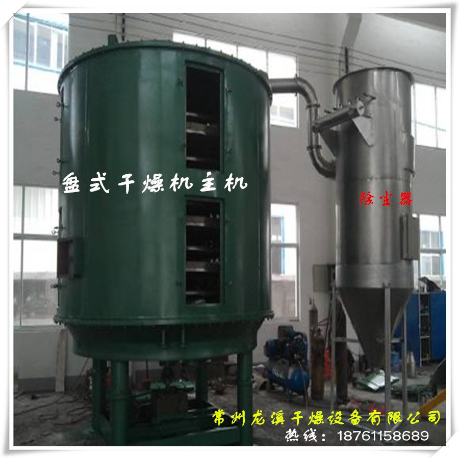湿物料自加料器连续地加到干燥器上部**层干燥盘上,带有耙叶的耙臂作回转运动,使耙臂连续地翻抄物料。物料沿指数螺旋线流过干燥盘表面,在小干燥盘上的物料被移送到外缘,在大干盘上的物料向里移动并从中间落料口落入下一层小干燥盘中。大小干燥盘上下交替排列,物料得以连续地流过整个干燥器。中空的干燥盘内通入加热介质,加热介质形式有饱和蒸汽、热水和导热油,加热介质由干燥盘的一端进入,从另一端导出。已干物料从*后一层干燥盘落到壳体的底层,*后被耙叶移送到出料口排出。湿汽从物料逸出,由设在顶盖上的排湿口排出,真空型盘式干燥器的湿汽由设在顶盖上的真空泵口抽出。从底层排出的干物料可直接包装。通过配加翅片加热器、溶剂回收冷凝器、袋式除尘器、干料返混机构、引风机等辅机,可提高其干燥的生产能力,干燥膏糊状和热敏性物料,可方便地回收溶剂,并能进行热解和反应操作。