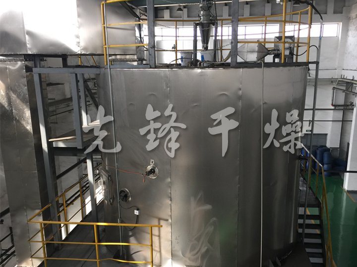 空气经过滤和加热,进入干燥器顶部空气分配器,热空气呈螺旋状均匀地进入干燥室。料液经塔体顶部的高速离心雾化器,(旋转)喷雾成极细微的雾状液珠,与热空气并流接触在极短的时间内可干燥为成品。成品连续地由干燥塔底部和旋风分离器中输出,废气由风机排空。