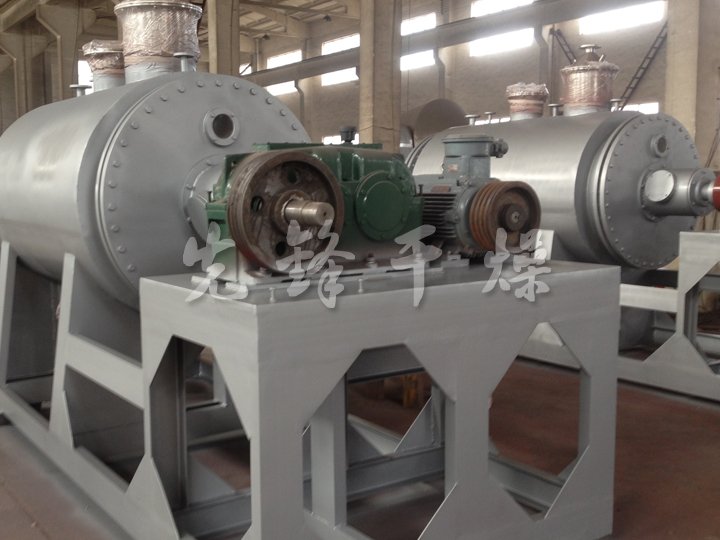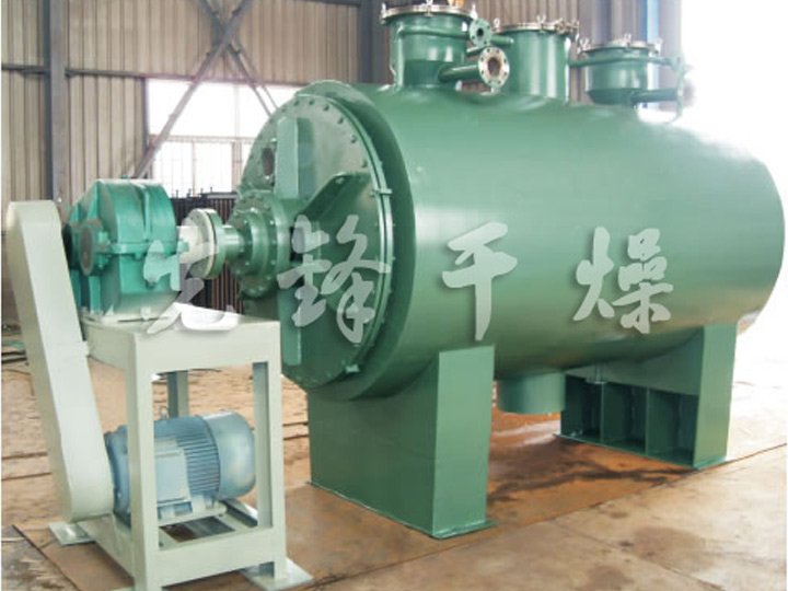 卧式搅拌真空干燥机是利用物料中的水份在真空状态下沸点降低的特点来进行干燥的设备。该设备用蒸汽(热水、导热油)对夹套间接加热,水份受热蒸发并被及时抽除。在干燥机壳体内部,耙齿通过传动轴带动,耙齿端与轴线设计有一定夹角,主轴通过正向反向转动,使物料沿轴向移动以利于干燥及出料。壳体内部可加入二根或四根敲击棒,以利于物料的快速干燥粉碎。敲击棒为与壳体等长的空心厚壁不锈钢管,其在壳体内部是自由运动的,敲击棒在内部不断敲击物料,使物料不断被敲碎(物料获得更大的比表面积)来加速干燥过程,成品物料质量更佳。