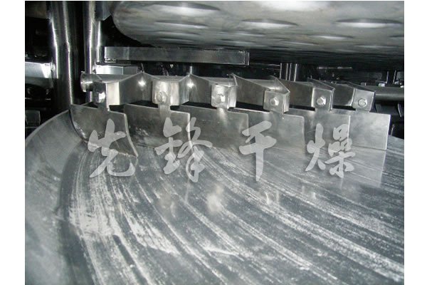 湿物料自加料器连续地加到干燥器上部**层干燥盘上,带有耙叶的耙臂作回转运动使耙臂作回转运动使耙叶连续地翻抄物料。物料沿指数螺旋线流过干燥盘表面,在小干燥盘上的物料被移送到外缘,并在外缘落到下方的大干燥盘外缘,在大干盘上物料向里移动并从中间落料口落如下一层小干燥盘中。大小干燥盘上下交替排列,物料得以连续地流过整个干燥器。中空的干燥盘内通入加热介质,加热介质形式有饱和蒸汽、热水和导热油,加热介质由干燥盘的一端进入,从另一端导出。已干物料从*后一层干燥盘落到壳体的底层,*后被耙叶移送到出料口排出。湿份从物料中逸出,由设在顶盖上的排湿口排出,真空型盘式干燥器的湿气由设在顶盖上的真空泵口排出。从底层排出的干物料可直接包装。通过配加翅片加热器、溶剂回收冷凝器、袋式除尘器、干料返混机构、引风机等辅机,可提高其干燥的生产能力,干燥膏糊状和热敏性物 料,可方便地回收溶剂,并能进行热解和反应操作。