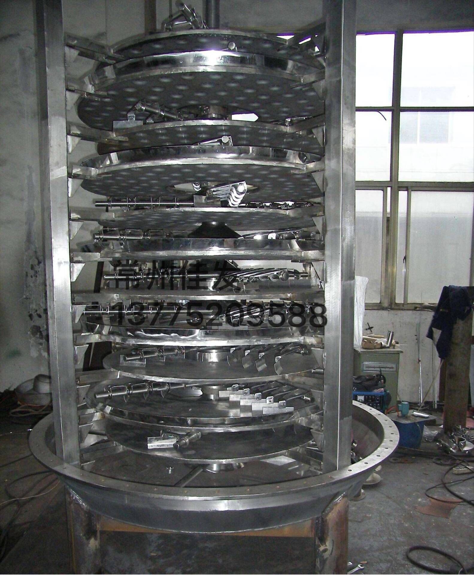 ★Wet materials are fed continuously to the top drying layer in the drier. They will be turned and stirred continuously by harrows’ s arm rotates, the material flows through the surface will be moved to its exterior edge and drop down ti the exterior edge of the large drying plate underneath, And will then be moved inward and drop down form its central hole to the small drying plate on the next layer. Both small and large drying plates are arranged alternately so as materials can go through the whole drier continuously. The heating media, which could be saturated steam, hot water or thermal oil will be led into drying plates from one end to other end of the drier. The dried product will drop from the last layer of the drying plate to the bottom layer of the body, and will be moved by harrows to the discharge outlet. The moisture exhausts from materials and will be removed from the moist discharge outlet on the top cover, or sucked out by the vacuum pump on the top cover for vacuum-type plate drier. The dried product discharged form the bottom layer can be cover for vacuum-type plate drier. The dried product discharged from the bottom layer can be packed directly. The drying capability can be raised up if equipped with supplementary devices such as finned heater, condenser for solvent recovery, bag dust filter, return and mix mechanism for dried materials and suction fan etc. solvent in those paste state and heat sensitive materials can be easily recovered, and thermal decomposition and reaction can be also carried out.