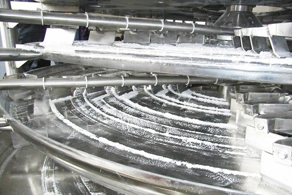 我公司的盘式干燥机具连续运行,热效率高。盘式连续干燥机以传导传热方式进行干燥,干燥过程中干燥器内只通入极少量(或不通入)空气,其尾气携带量很少,故其热效率可达65%以上。动力消耗低、噪音小。由于干燥过程中料层很薄,主轴转速低,物料传送系统所需的功率小,电耗很少,其全套干燥装置动力消耗仅是对流方式传热装置动力消耗的1/5~1/7,且噪音很小。