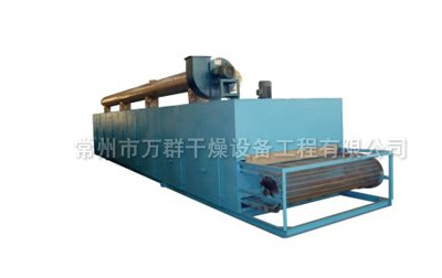 物料由加料器均匀地铺在网带上,网带一般采用12-60目不锈钢丝网,由传动装置拖动在干燥机内移动。干燥机由若干单元组成,单元热风单个循环,部分尾气由专门排湿风机排出,废气由调节阀控制,热气由下往上或由上往下穿过铺满物料的网带完成热量与质量传递的进程,带走物料水份。网带缓慢移动,运行速度可根据物料温度自由调节,干燥后的成品连续落入收料器中。上下循环单元根据用户需要可灵 活配备,单元数量亦可根据需要选取。
