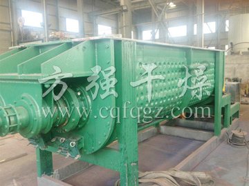 空心轴上密集排列着楔型中空浆叶,热介质经空心轴流经浆叶。单位有效容积内传热面积很大,热介质温度从-40℃到320℃,可以是水蒸汽,也可以是液体型:如热水、导热油等。间接传导加热,没有携带空气带走热量,热量均用来加热物料。热量损失仅为通过器体保温层向环境的散热。楔型浆叶传热面具有自清洁功能。物料颗粒与楔型面的相对运动产生洗刷作用,能够洗刷掉楔型面上附着物料,使运转中一直保持着清洁的传热面。浆叶干燥机的壳体为Ω型,壳体内一般安排二到四根空心搅拌轴。壳体有密封端盖与上盖,防止物料粉尘外泄而充分发挥作用。