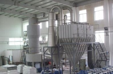 旋转闪蒸干燥机热空气切线进入干燥器底部,在搅拌器带动下形成强有力的旋转风场。膏状物料由螺旋加料器进入干燥器内,在高速旋转搅拌桨的强烈作用下,物料受撞击、磨擦及剪切力的作用下得到分散,块状物料迅速粉碎,与热空气充分接触、受热、干燥。脱水后的干物料随热气流上升,分级环将大颗粒截留,小颗粒从环中心排出干燥器外,由旋风分离器和除尘器回收,未干透或大块物料受离心力作用甩向器壁,重新落到底部被粉碎干燥。
