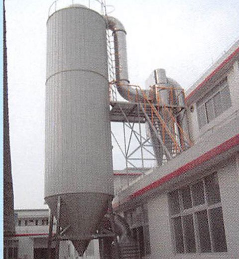 洁净空气冷却后进入制粒塔,在塔内使用离心造粒专用喷头,通过变频调速将各种料液雾化成所需要的微小液滴,并与冷风进行快速热交换,带走料液中的热量,物料从塔底和旋风分离器中排出。