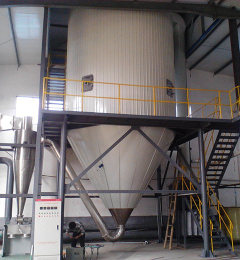 洁净空气冷却后进入制粒塔,在塔内使用离心造粒专用喷头,通过变频调速将各种料液雾化成所需要的微小液滴,并与冷风进行快速热交换,带走料液中的热量,物料从塔底和旋风分离器中排出。