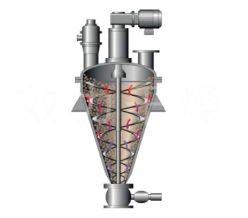 螺旋搅拌可把物料由底部提升到高点再自由散落的不断运动,导致物料不断的在夹套和螺旋带加热区运动。①增加了加热面积②使物料保持松散的工况下运动。