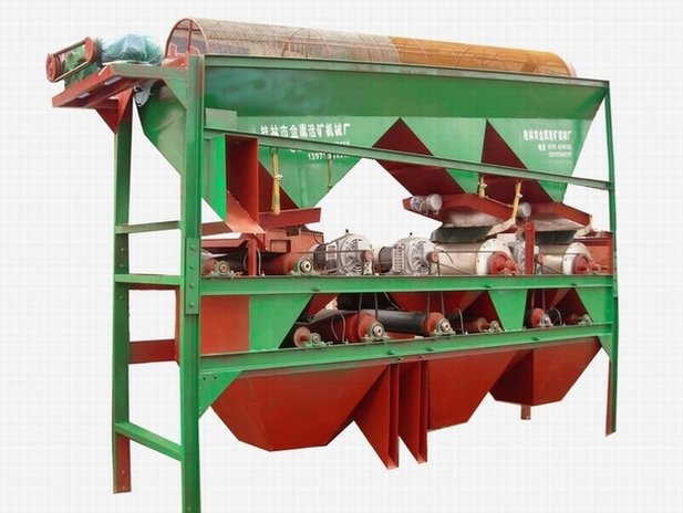 功能及特点:(1)本机用于选别8mm-16mm粒级的磁性矿物,在以磁选可行性的基础上,通过组合形式的设计,把分散式选矿流程转变为集中式选矿流程;显著提高了矿选效率和品(2)本机采用永磁磁系设计,工作稳定,精矿品位得以保证。(3)干式强磁选机根据矿物粒度采用单一磁系设计,机体部分矿物可选性粒度保证在16㎜以下,大于16㎜粒度不能进入磁系进行选别。(4)整机结构简单,传动部分采用外裸式,实现了生产过程中的快速维护保养和检修。(5)本机融入较高的电气控制技术,使生产操作便捷易懂,在提高工作效率的同时减轻操作者的劳动强度。干式强磁选机分选斗中设有可调节分隔板,分隔板均采用不锈钢制造,能有效的保证机器使用寿命,同时避免铁锈影响矿物品位的可能;分隔板能活调节和快速固定,对生产过程中矿位品质的保证起着很大作用。整机结构简单,刚度强,适合在较为恶劣的环境中进行高效率的生产。本机具有操作方便,检修直观,选矿充分,精矿品位高等特点。皮带式全磁辊选别性能受矿粒度影响较小,同时由于大粒度矿物中杂质与矿晶体并存,细分度不高,矿晶体受杂质势能影响比较大;因此采用磁滚筒对磁性矿进行选别,然后采用强磁性的磁磁辊直接进行一二,三级选别,目的在于提高矿物回收率。整机动作控制由专门的控制箱实现,动力源分别由一台为3KW减速电机和一台1.5KW的调速电机供应,调速电机的选用保证了机械部分的稳定持久工作;同时也能让操作者对速度进行灵活控制。通过严谨的传动比计算,确保了本机在保证矿位品质的前提下真正意义上的提高了处理量。本机出矿口出矿品位可分为磁性精矿、弱磁性精矿、中矿,尾矿三种,同时可根据需要改为一级精矿、二级精矿、中矿、和尾矿四种品位。