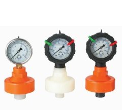 PP全塑隔膜压力表产品简介全塑隔膜压力表是由通用的塑壳压力表与一个全塑材料的隔膜体配合连接而成的。全塑隔膜压力表主要部件均采用塑料部件制作,隔离膜片采用PTFE/FPM材质,具有好的防强腐蚀性能。此仪