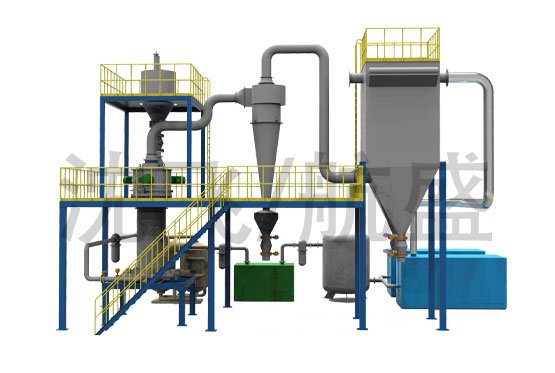 开机时先持续冲入惰性气体,置换系统内空气,直至全系统达到氧含量探测仪设定的安全数值;在启动加料装置将料仓中原料均匀加入主机,经压缩的惰性气体通过特殊设计和优化的喷咀高速喷出。物料被膨胀、降温的超音速喷射流加速,在喷咀交汇处(磨腔中心研磨区)因互相冲击、碰撞而粉碎。粉碎的物料随上升气流进入分级区,达到粒度要求的细粉方可通过分级轮,被旋风分离器、捕集器收集;粗粒返回粉碎区继续粉碎,惰性气体经过滤器处理后返回系统循环使用。