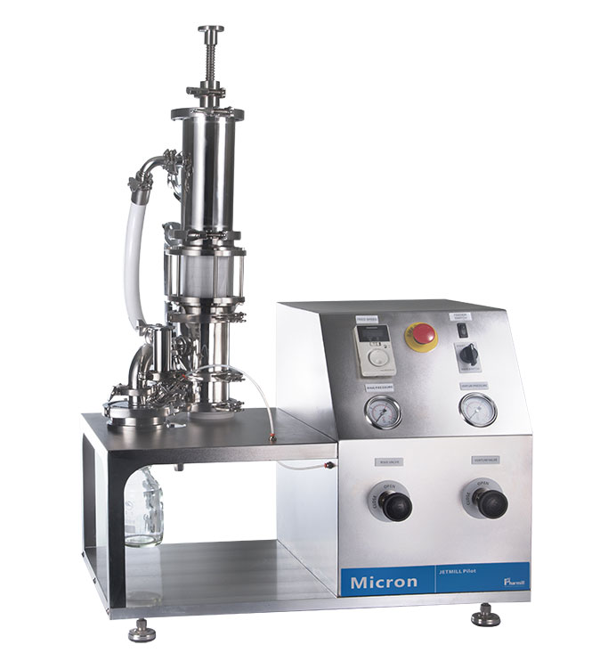 医药粉体物料从切线方向在压缩空气或者氮气得作用下以亚音速约50米/秒的速度进入扁平圆柱形的粉碎箱内,然后在周边气流喷嘴的的作用下不断的被加速到300米/秒,并形成螺旋形运动轨迹,当刚刚进入粉碎箱的速度较慢的物料在螺旋运动轨迹上碰到加速后的物料后,就会发生碰撞,从而达到粉碎效果。离心力的作用会让较大的颗粒在粉碎箱周边运动,而较小的颗粒随气流从粉碎箱中部出口随气流排出,这个粉碎过程是在恒定的温度下进行的(属于吸热过程),与市场上其他的类似设备相比,具有独特的*低的气流消耗量.