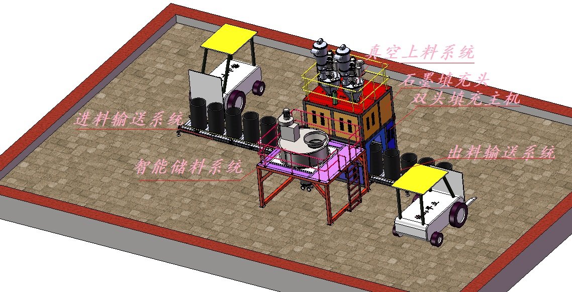 该机主要针对坩埚填充劳动强度大,传统灌装填充密实度不够,效率低,对工人健康伤害大并且填充过程中粉尘扬尘严重等问题,而开发设计,根据装在容器下面的位置传感器给出的信号完成充填、挤压、计量及升降等工作,在充填过程中,专用的脱气装置将粉料中混合的大量空气分离,并对物料压缩挤压处理,装填同步液压升降挤压可以填充的物料压实,本设置填充过程中粉尘将大幅度减少,基本能实现高密度填充,让相同容积的坩埚能装填更多石墨粉料。本机特别适用于填充负极材料碳化与石墨化环节的坩埚填充。。