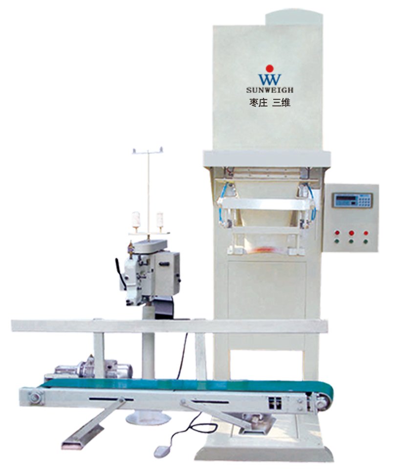 超细粉定量包装秤称重前,需在仪表上设定目标重量,需人工将包装袋套入下料口,拨动夹袋开关,控制系统接收到套袋信号后驱动气缸,由夹带器将包装袋夹住,同时启动给料机构将料仓物料送入包装秤,送料机构为双螺旋送料,达到目标重量时,送料机构停止给料,夹带器自动打开,包装袋自动落到输送机上,输送机将包装袋向后输送进行人工辅助缝口,向后输出,完成一次装袋过程。