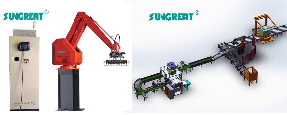 合肥奥博特码垛机器人结构简单,容易保养及维护;适用于各种箱装、袋装、罐装、桶装等包装物料的码垛及拆垛工作,全部动作可在控制柜屏幕上设置,界面简单,任何人都可监控管理。码垛机器人按一定排列将物料码放在托盘上,进行自动堆码,可堆码多层,然后用叉车运至仓库储存。奥博特码垛机器人可全天候作业,一台机器可代替六位工人,平均每年可为企业节省几十万的人力资源成本,同时实现工厂智能化操作管理!
