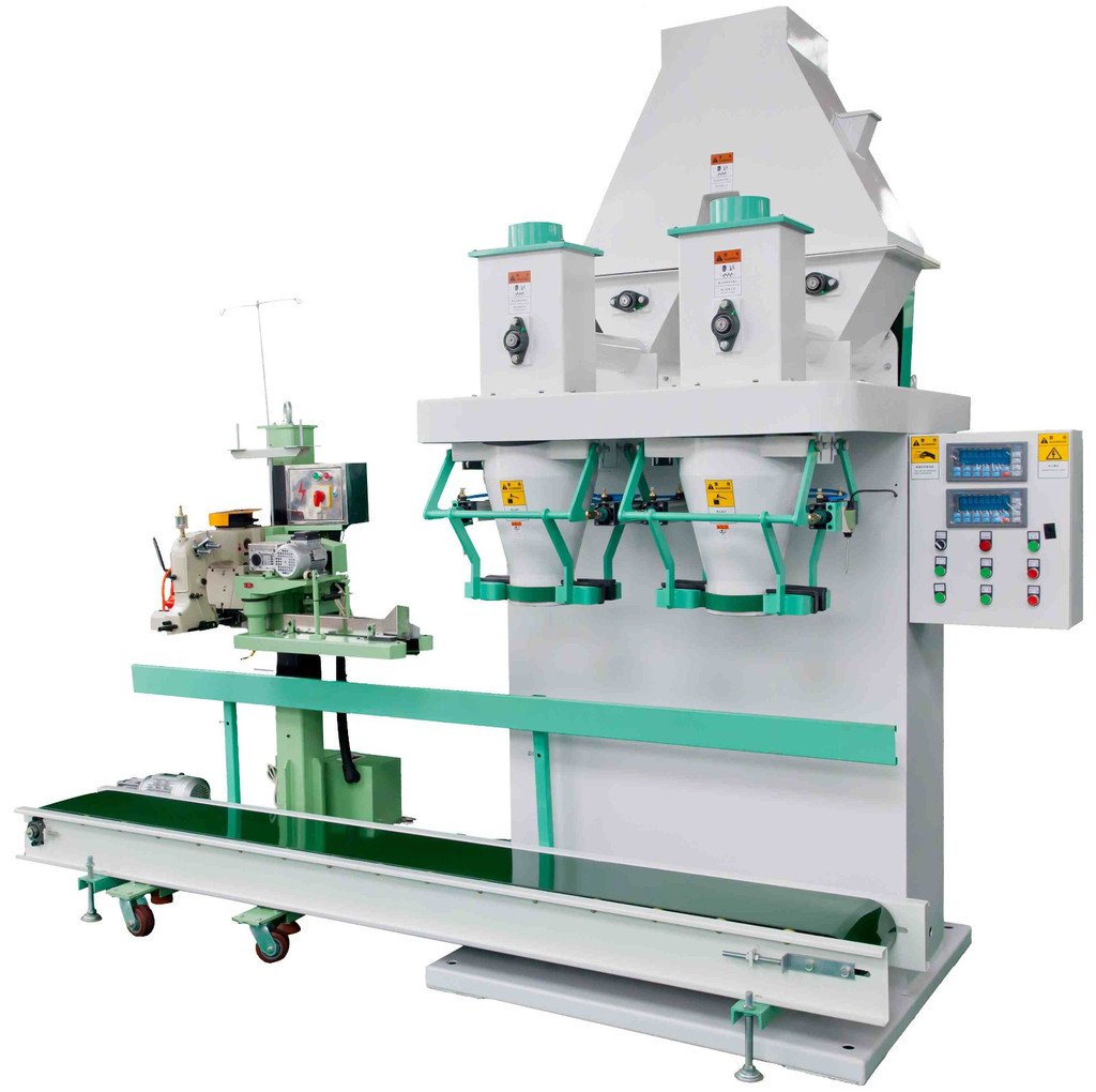 当定量包装秤进入自动运行状态后,称重控制系统打开给料门开始加料,自动定量包装秤给料装置为快、料方式;当物料重量达到快给料设定值时,停止快给料,保持慢给料;当物料重量达到终设定值时,关闭给料门,完成动态称重过程;此时系统检测夹袋装置是否处于预定状态,当自动定量包装秤包装袋已夹紧后,系统发出控制信号打开称量斗卸料门,物料进入包装袋中,物料放完后自动关闭称量斗的卸料门;卸空物料后松开夹袋装置,自动定量包装秤包装袋自动落下;包装袋落下后进行缝包并输送到下一工位。如此往复自动运行
